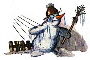 Тает снег. И снеговик тает. Весна в самом разгаре, уже и птицы с юга домой вернулись. И осталась от снеговика только лужица талой воды.